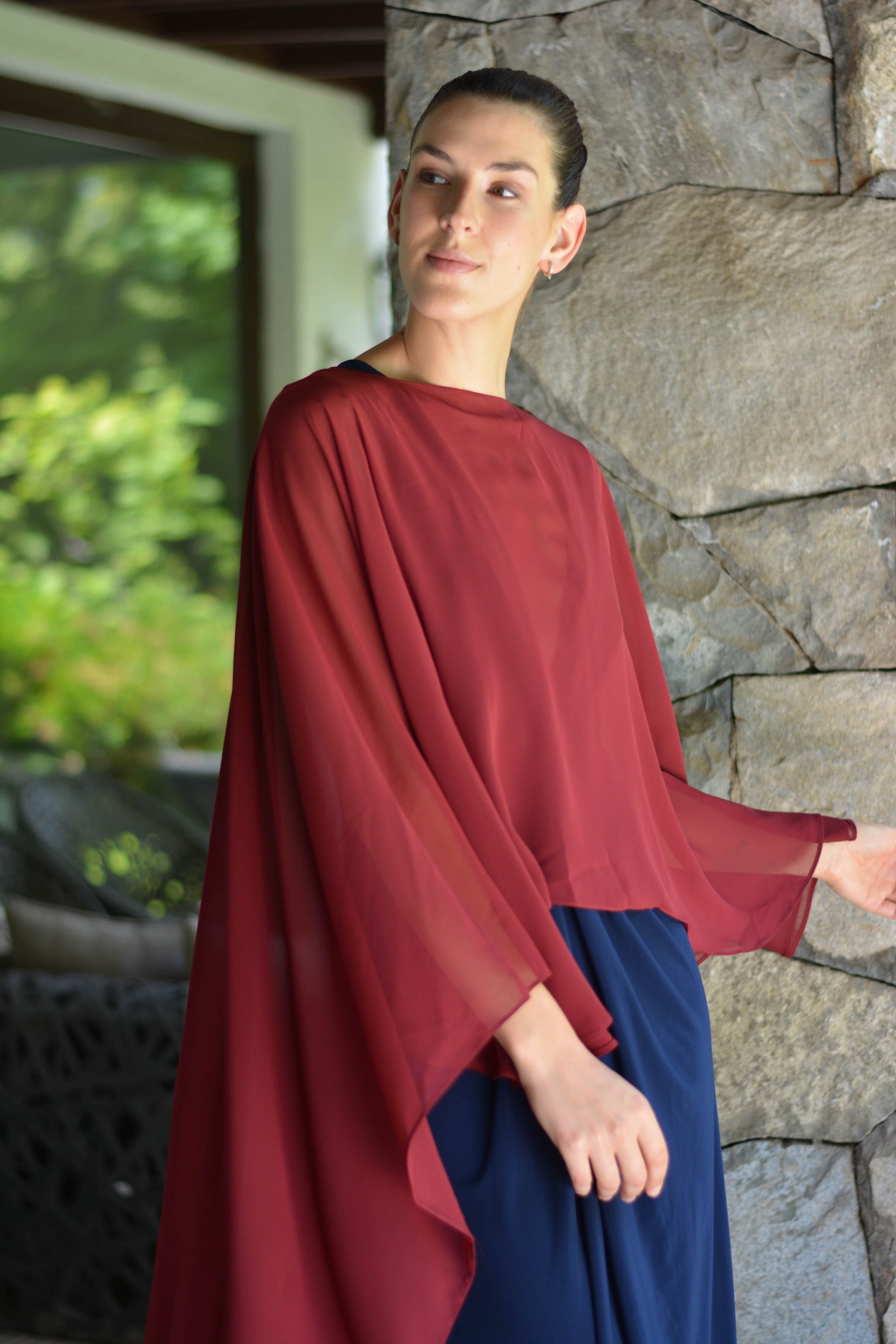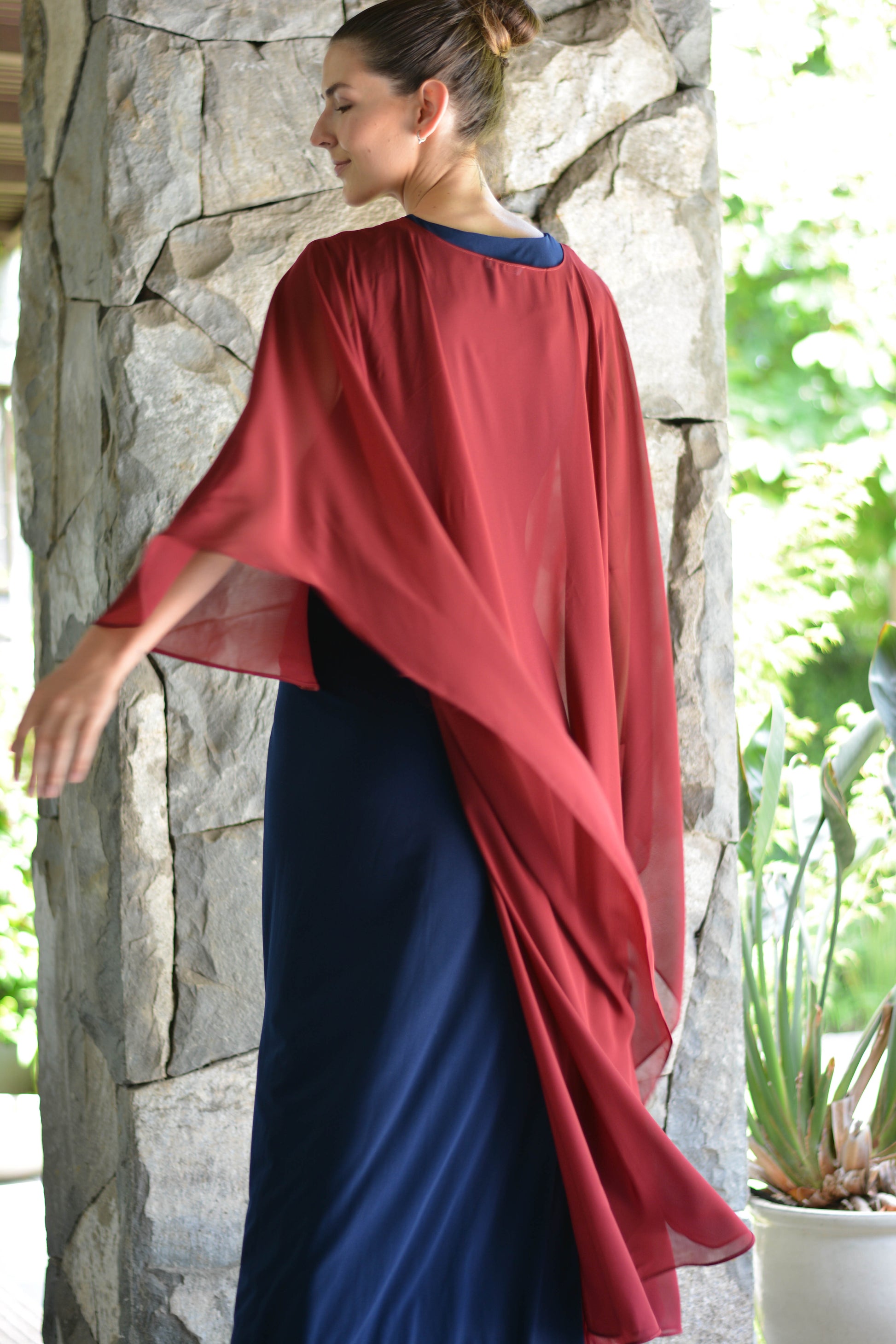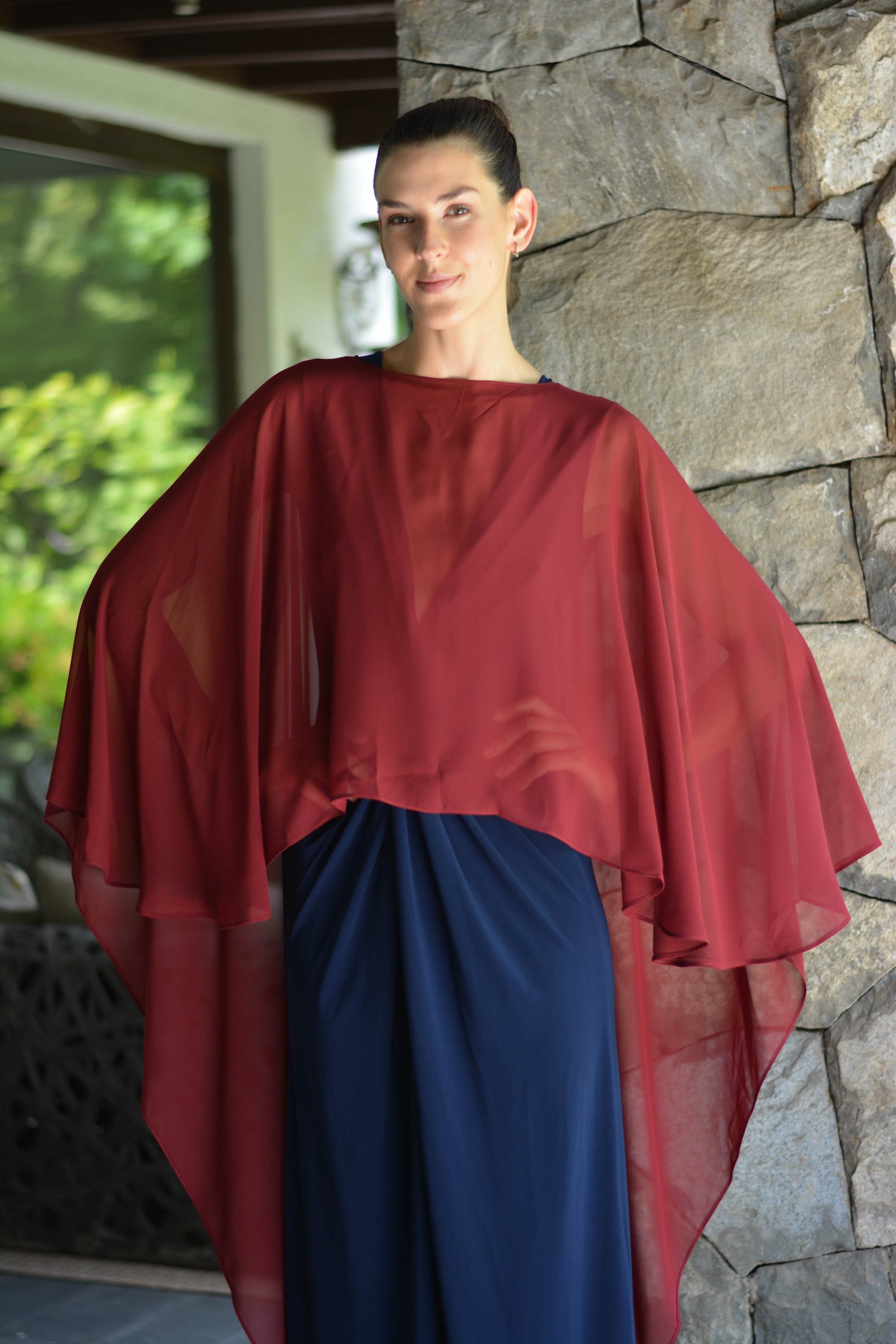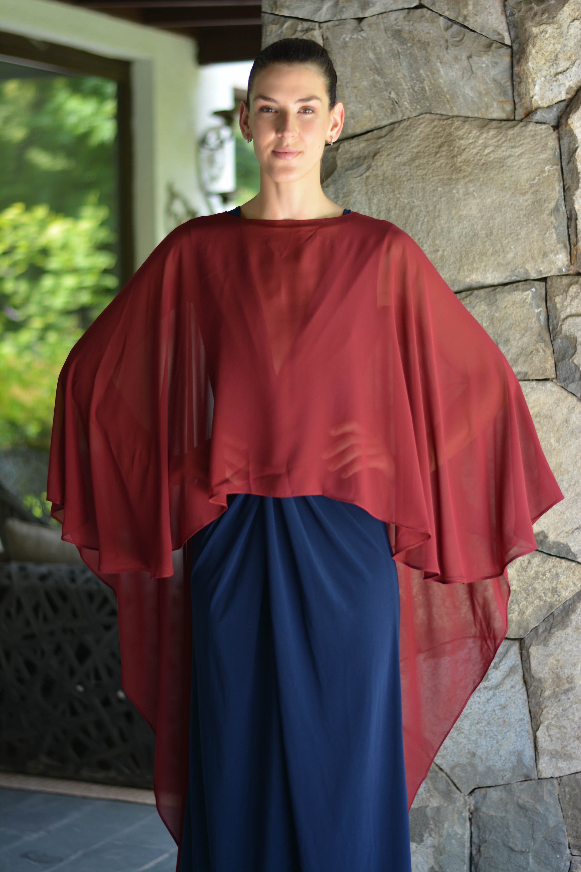 Confeccionada de gasa ligera y fluida nuestra capa te dará un toque elegante y sofisticado para un evento tanto de día como de noche. Su forma te peritará jugar con tu look, por ejemplo tapando tus brazos o arremangarla al cuello dejándola caer solo en la espalda.