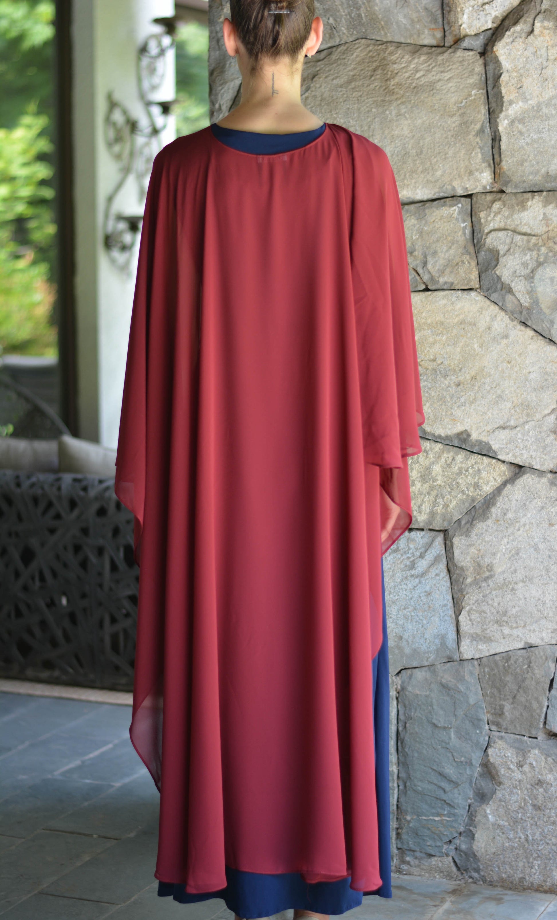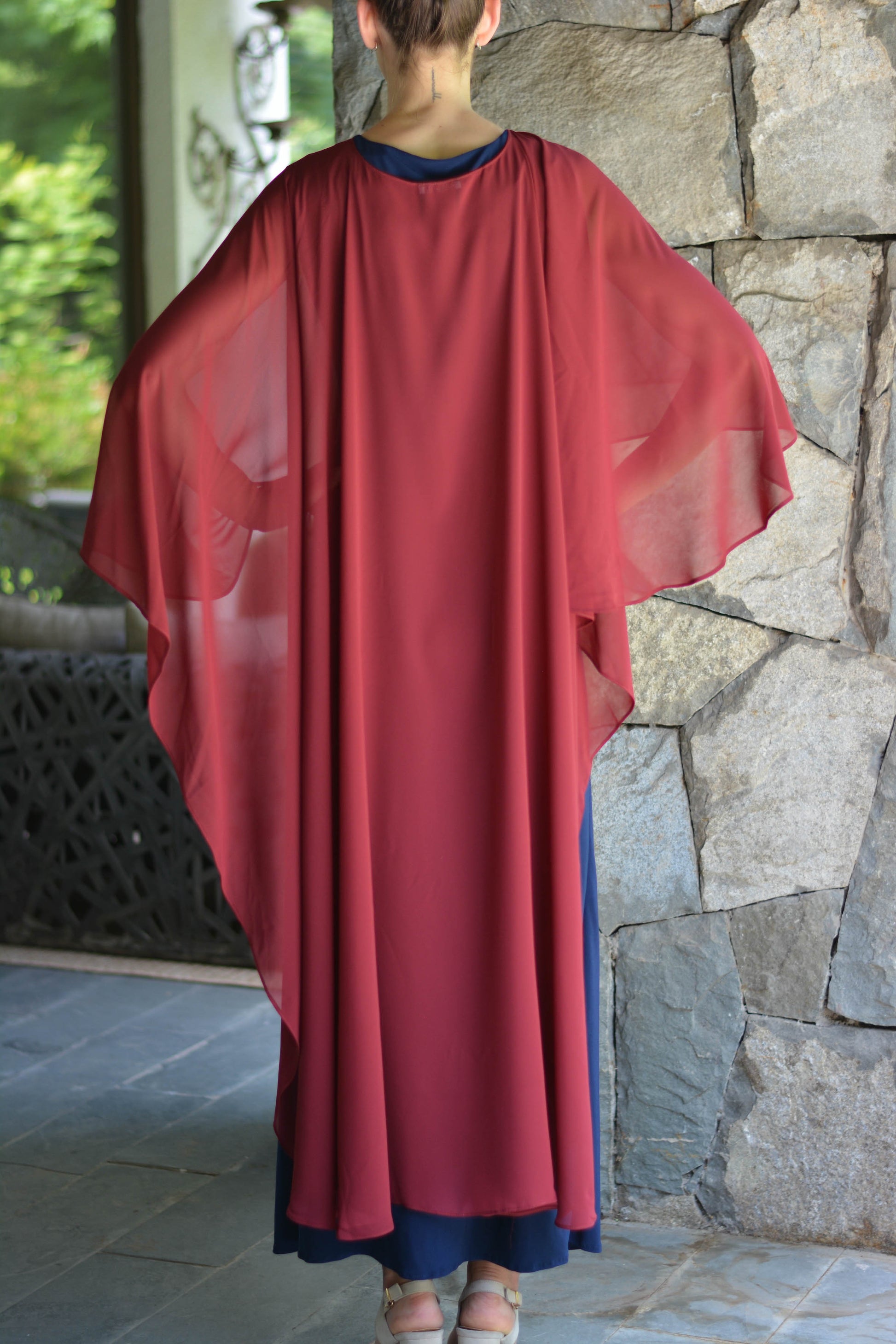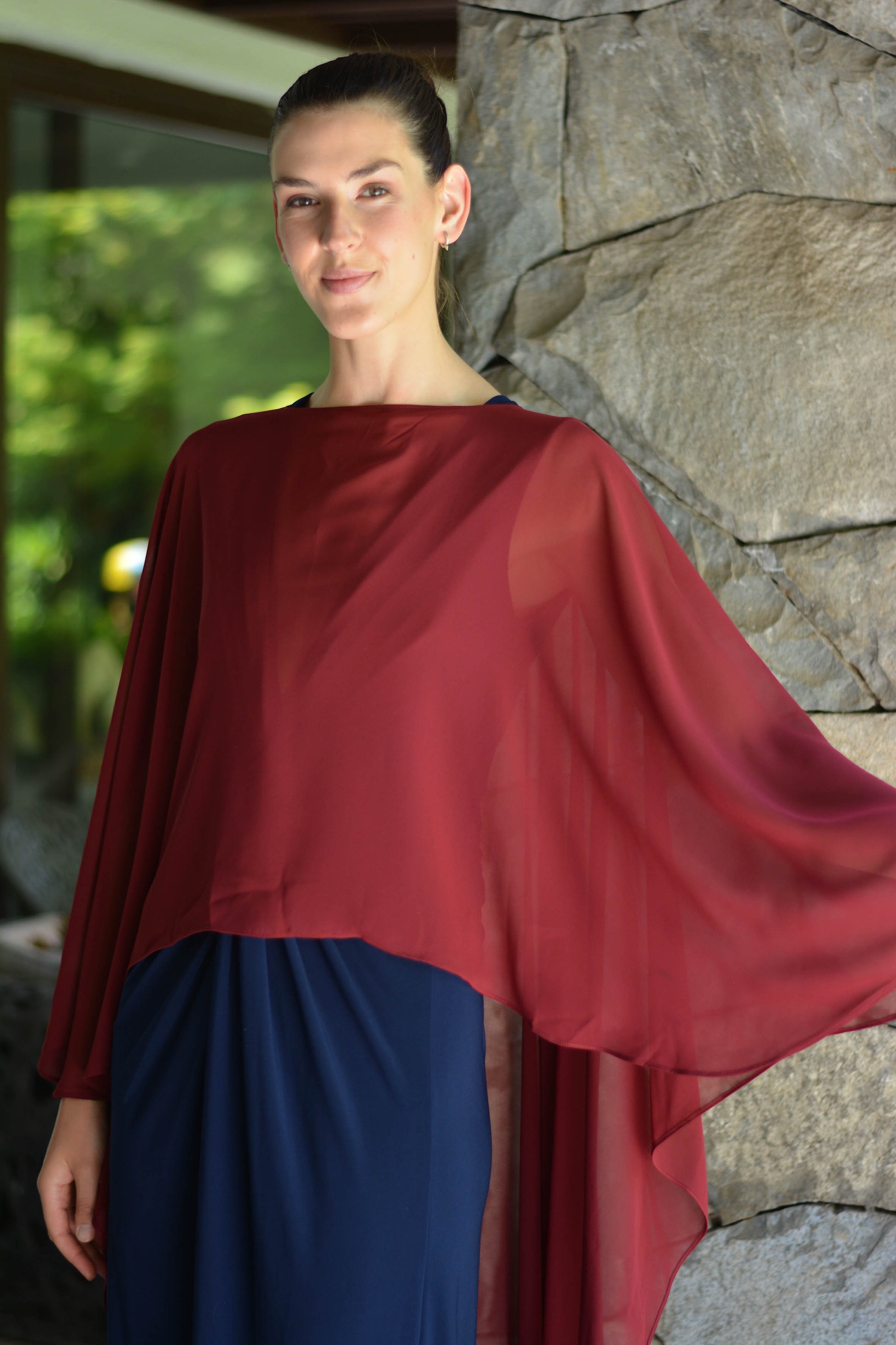 Confeccionada de gasa ligera y fluida nuestra capa te dará un toque elegante y sofisticado para un evento tanto de día como de noche. Su forma te peritará jugar con tu look, por ejemplo tapando tus brazos o arremangarla al cuello dejándola caer solo en la espalda.