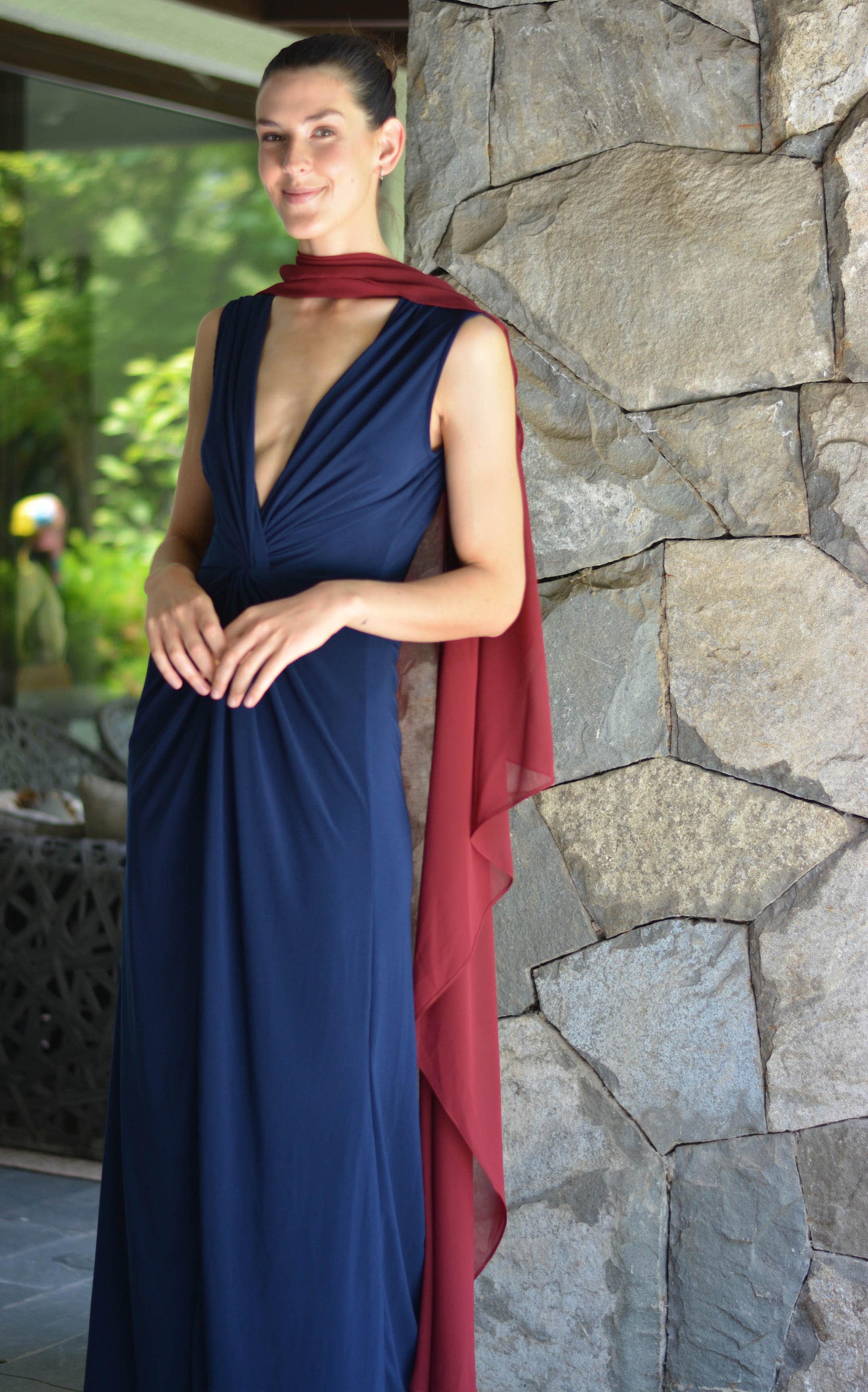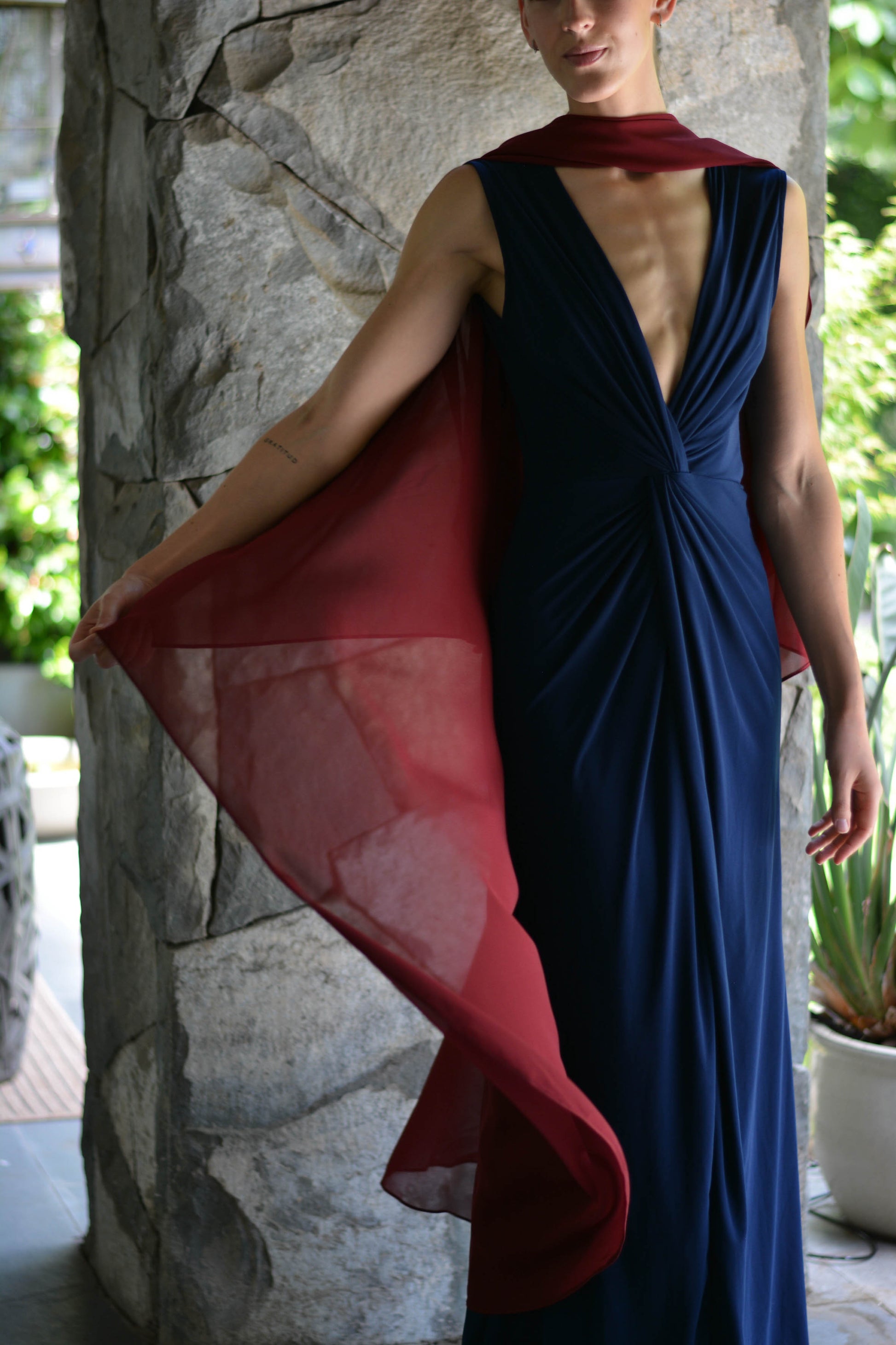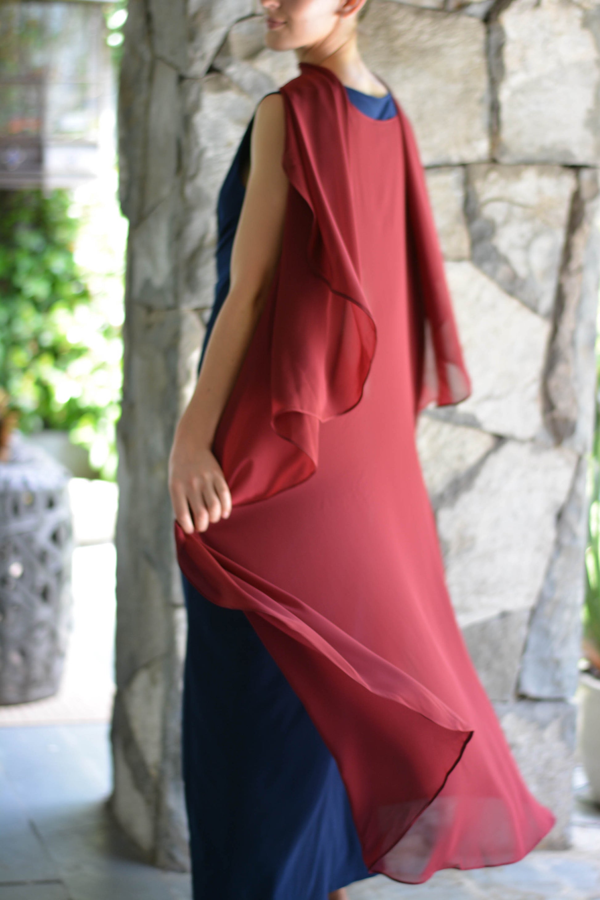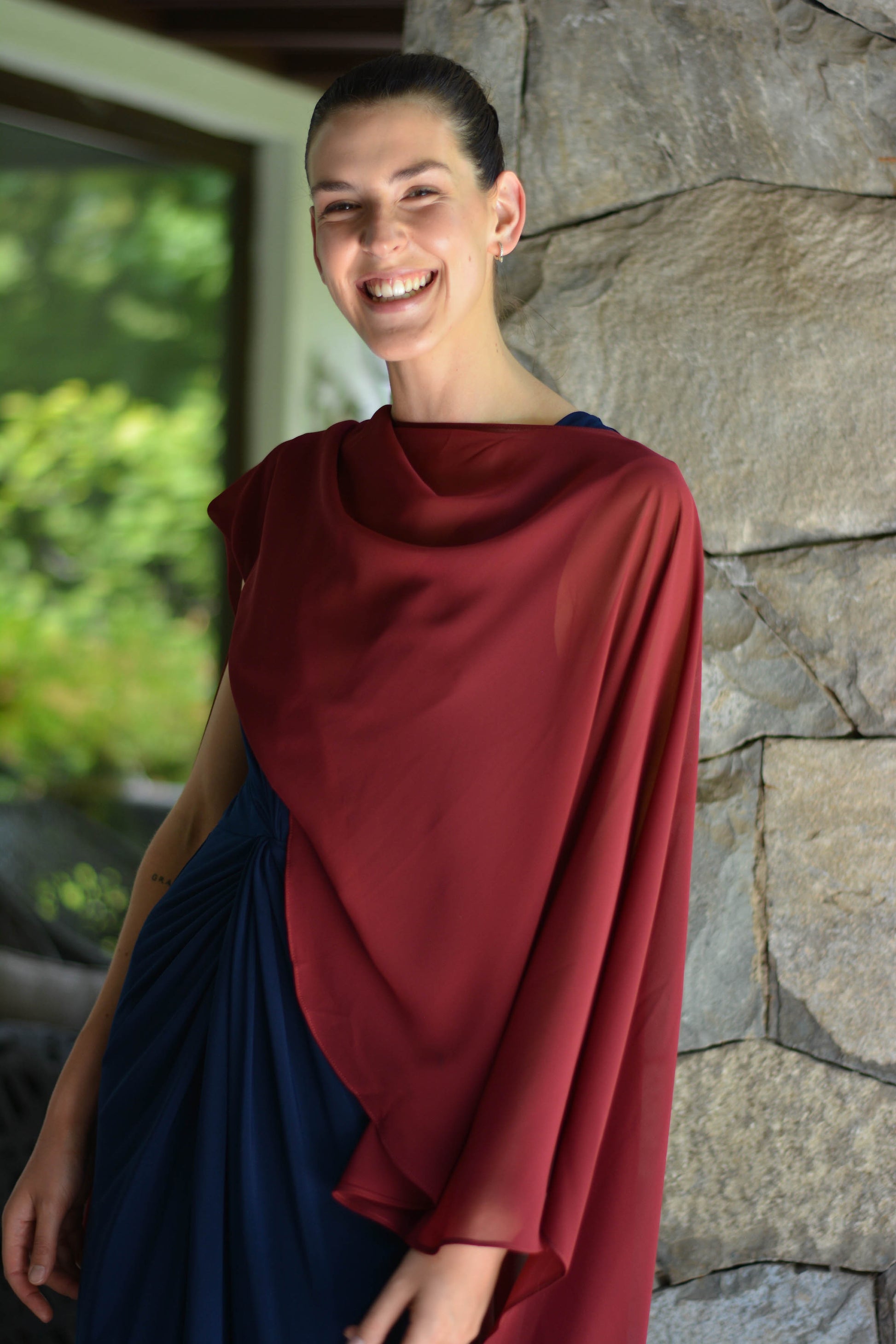 Confeccionada de gasa ligera y fluida nuestra capa te dará un toque elegante y sofisticado para un evento tanto de día como de noche. Su forma te peritará jugar con tu look, por ejemplo tapando tus brazos o arremangarla al cuello dejándola caer solo en la espalda.