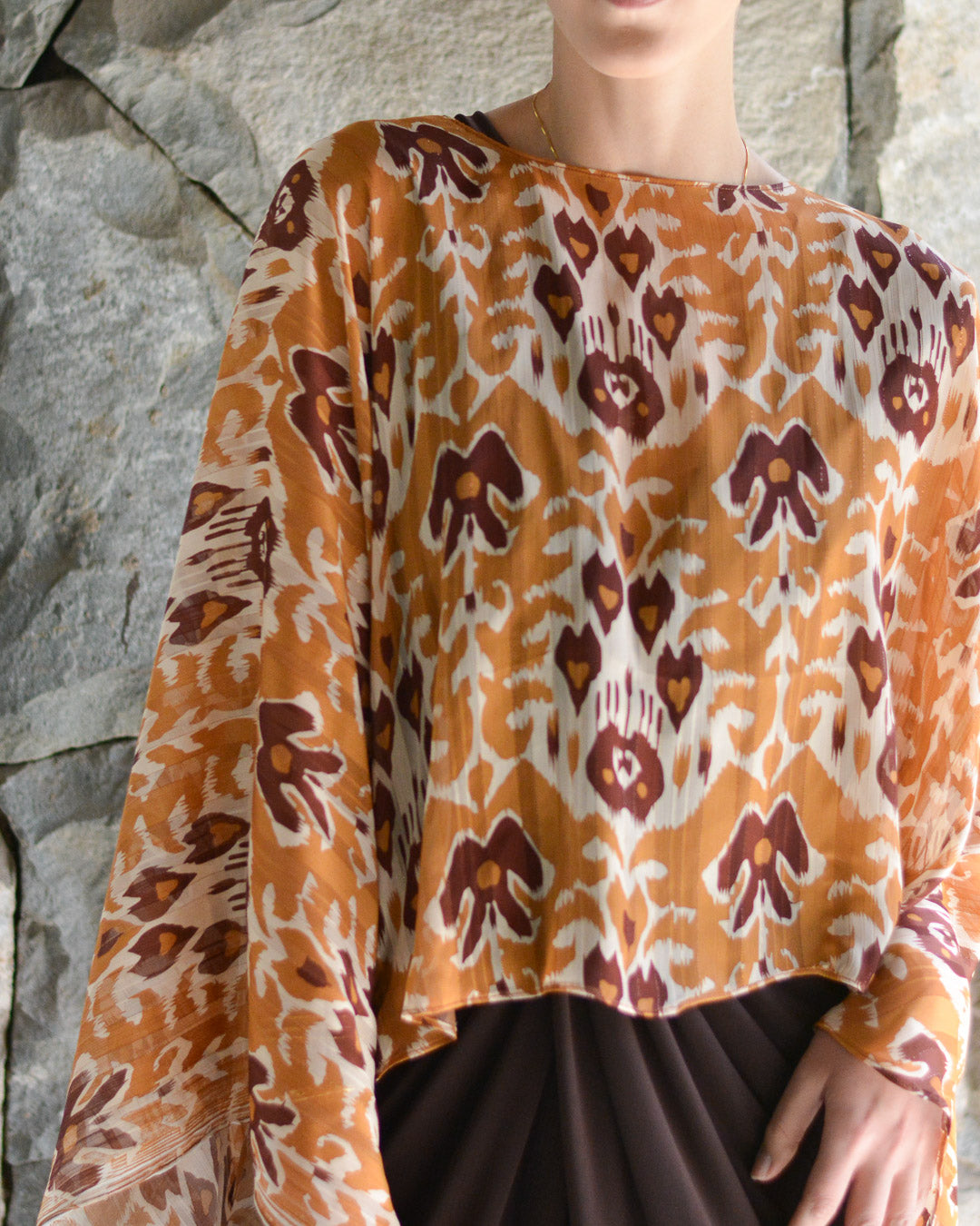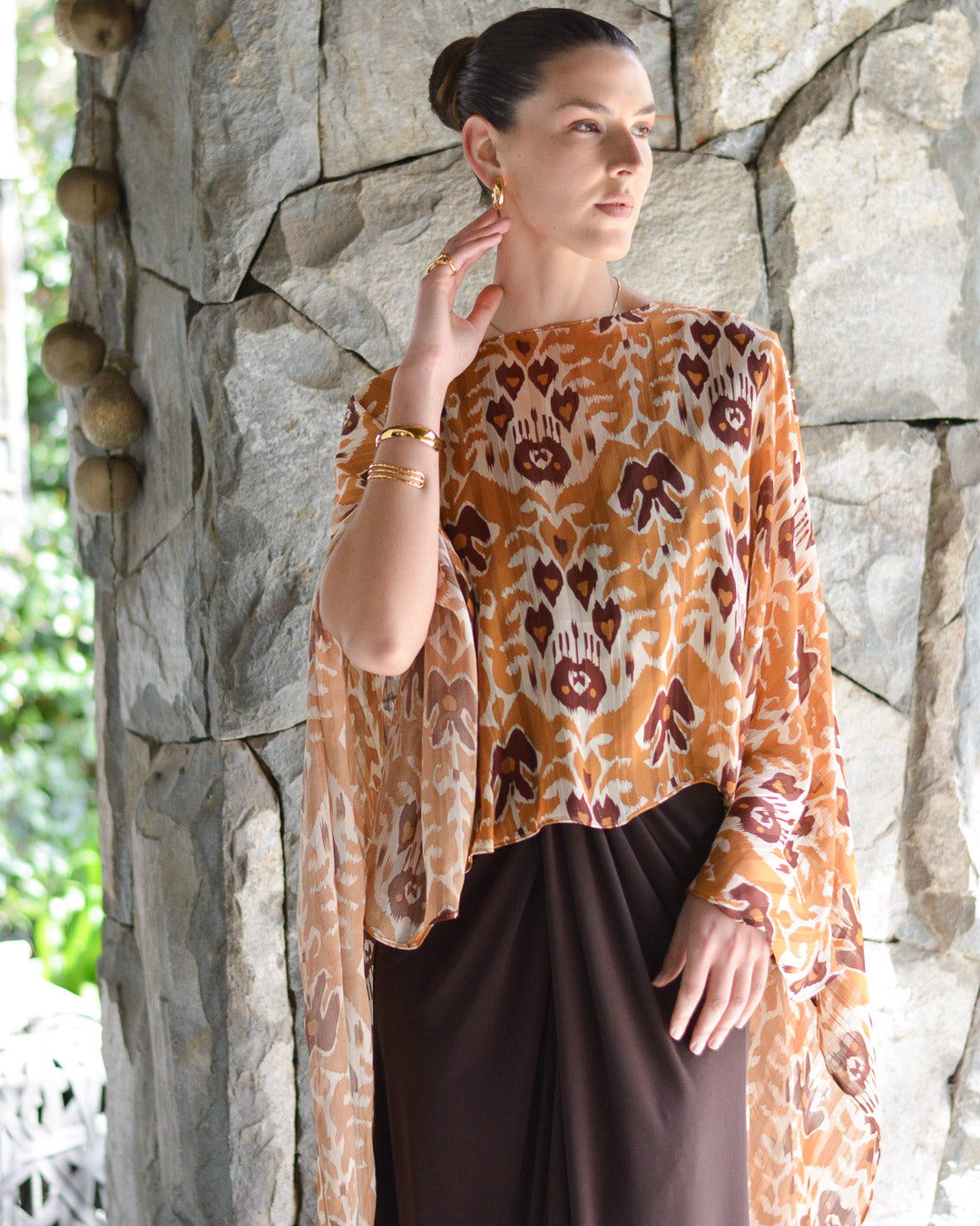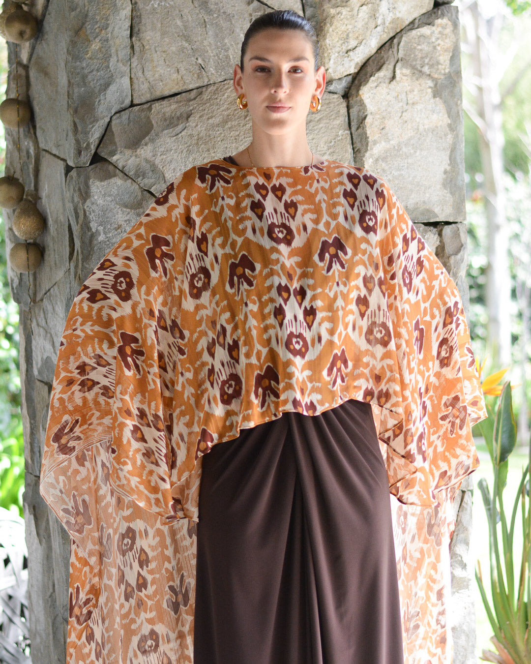 Confeccionada de gasa ligera y fluida nuestra capa te dará un toque elegante y sofisticado para un evento tanto de día como de noche. Su forma te peritará jugar con tu look, por ejemplo tapando tus brazos o arremangarla al cuello dejándola caer solo en la espalda.