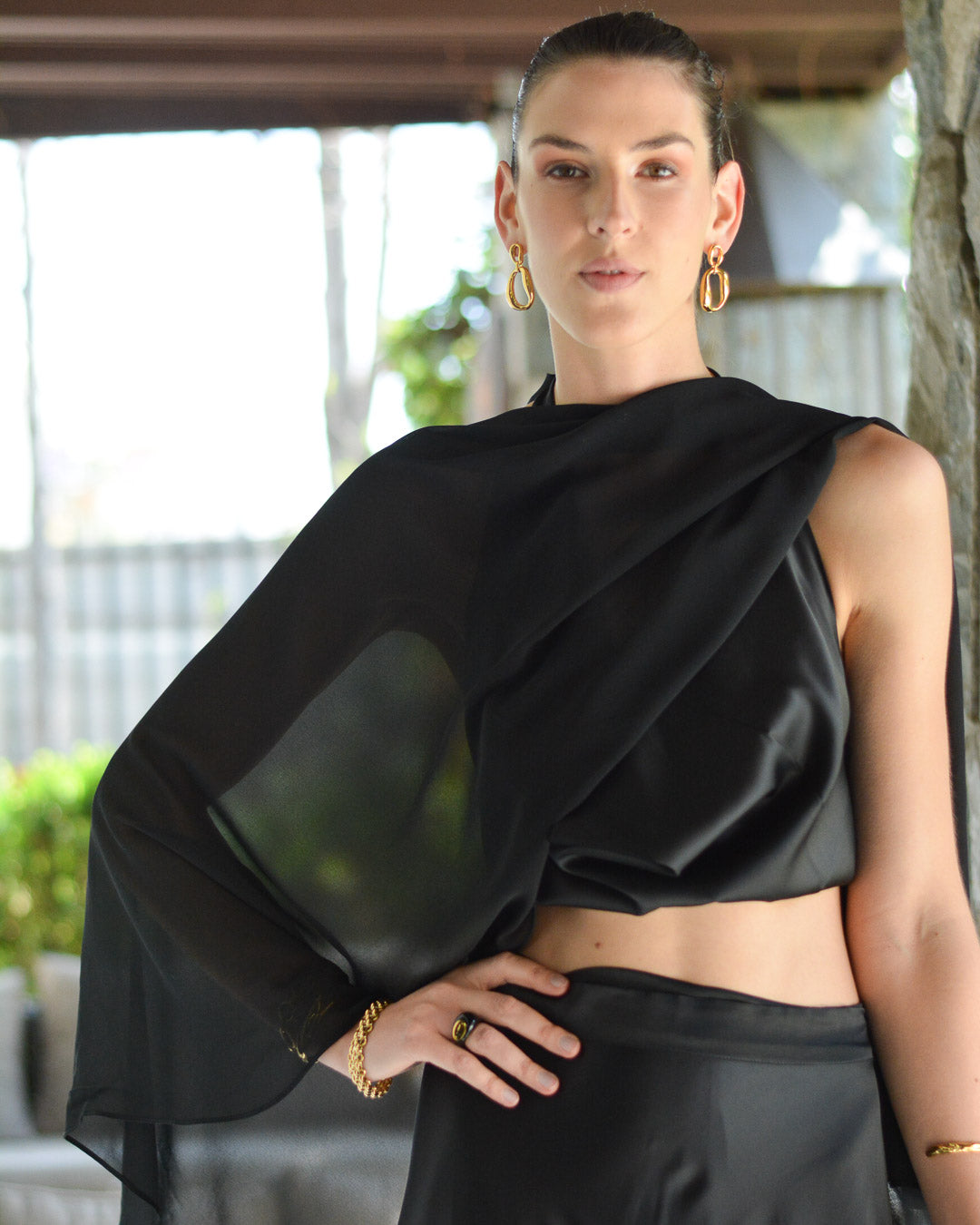Confeccionada de gasa ligera y fluida nuestra capa te dará un toque elegante y sofisticado para un evento tanto de día como de noche. Su forma te peritará jugar con tu look, por ejemplo tapando tus brazos o arremangarla al cuello dejándola caer solo en la espalda.