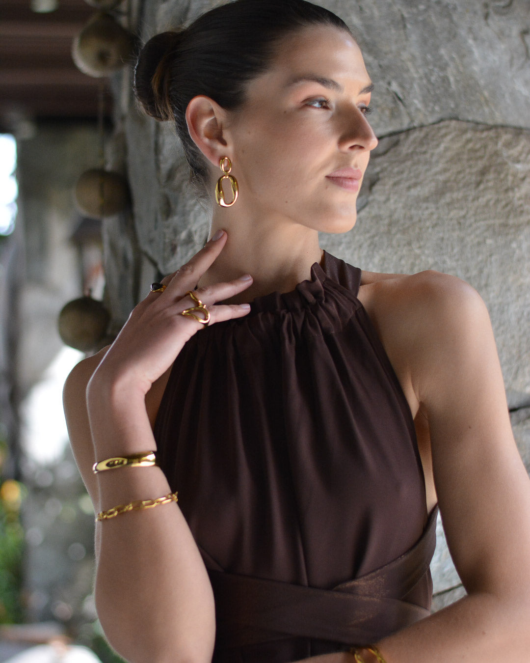 Su diseño de talla única se adapta a distintas siluetas y puede usarse de dos formas: abrochado al cuello para un look más suelto y relajado, o cruzado y anudado a la cintura, marcando tu figura con un estilo más ajustado.